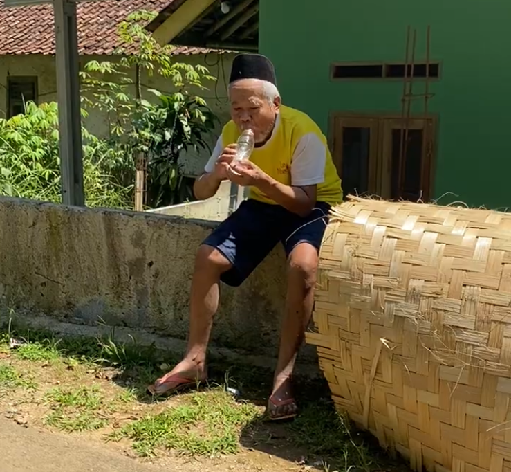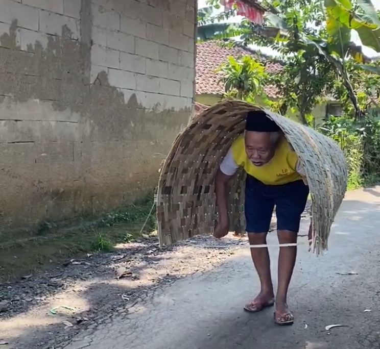 Di usianya yang menginjak 80 tahun, dengan tubuh bungkuk dan tangan yang gemetaran hebat, beliau tetap memanggul bilik bambu dilingkarkan di pundaknya, keliling dari satu kampung ke kampung lain. Tapi hari ini… tak satu pun bilik yang laku.