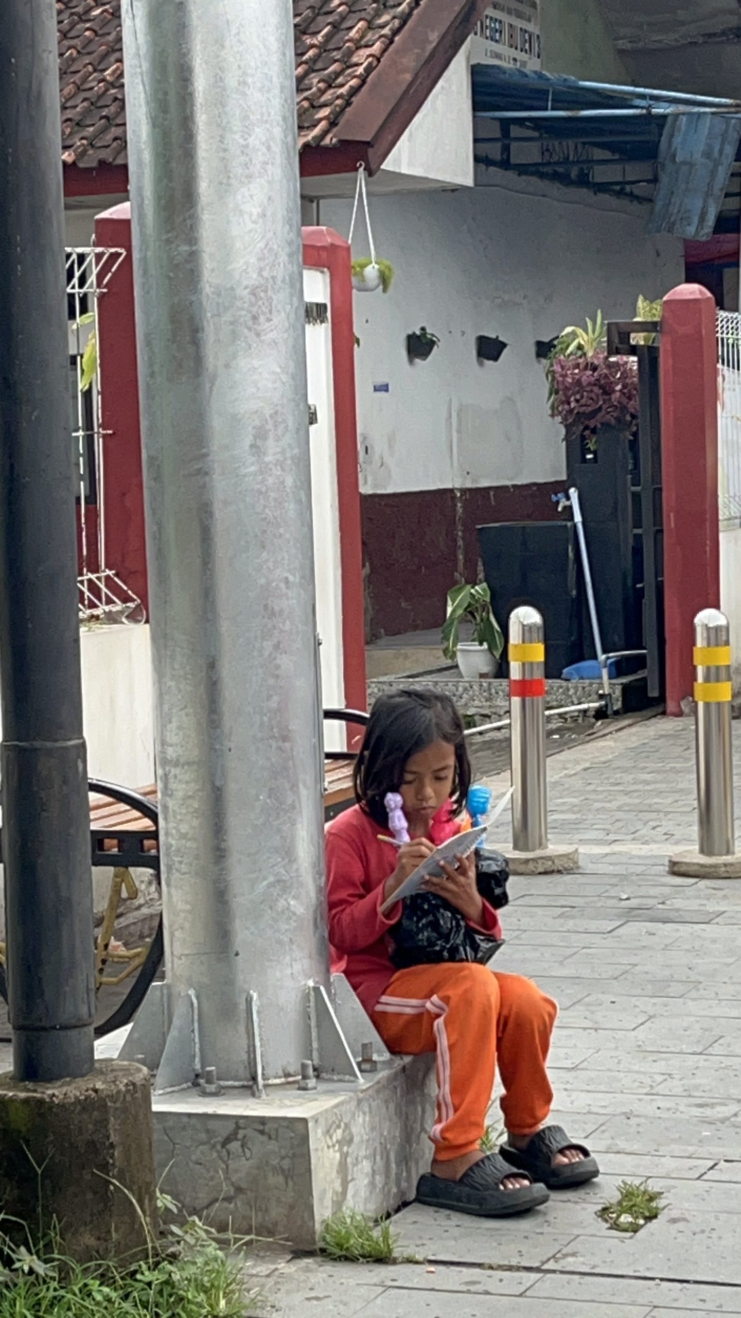 Tak hanya kedewasaan, hebatnya Aisyah tetap semangat berjuang untuk sekolah. Saat berjualan di pinggir jalan, ia cari tempat duduk seadanya dan mengerjakan PR-nya. Buku dan alat tulis ia masukan ke dalam plastik berbarengan dengan balon sabun yang ia jual.