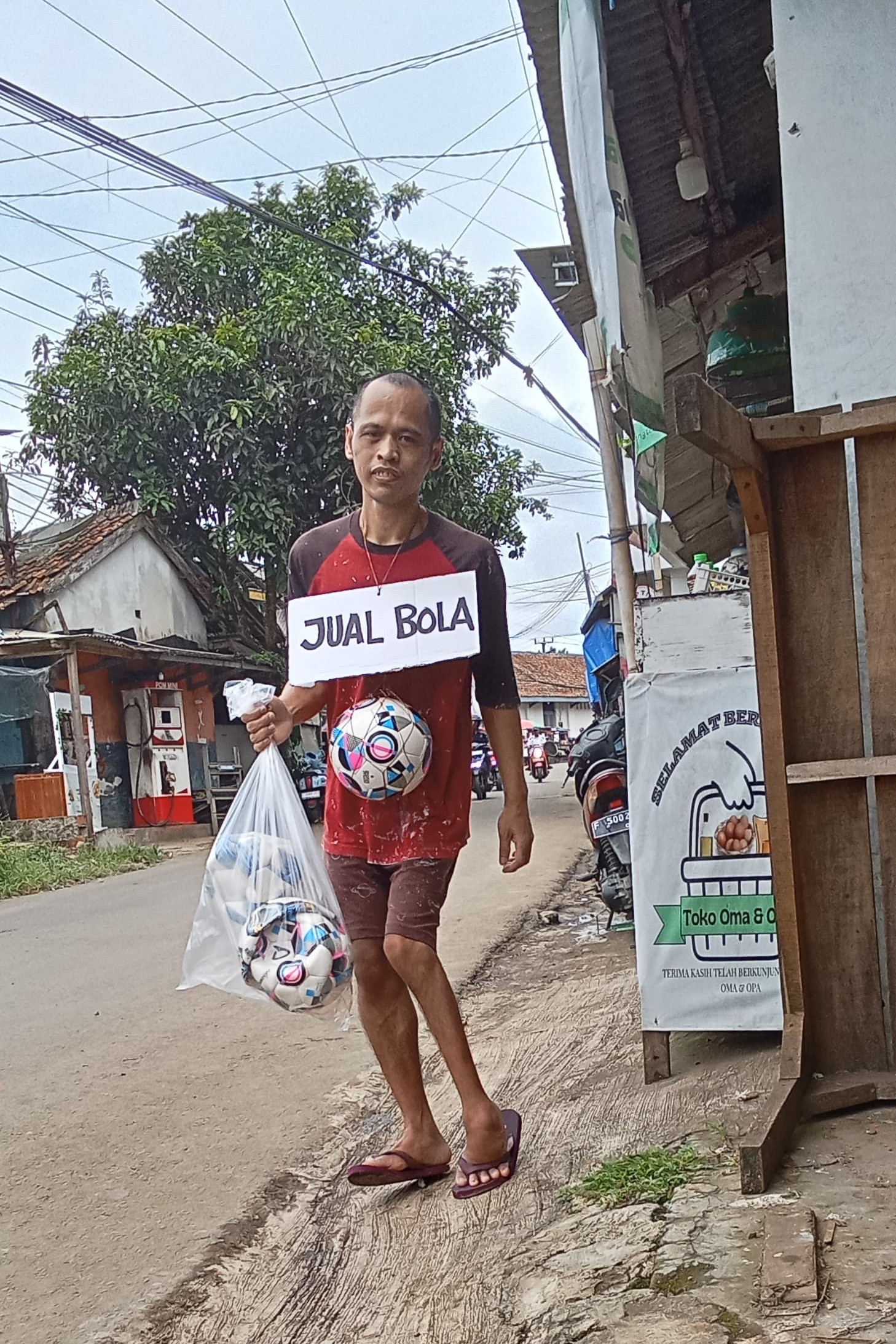 Setiap harinya, Mang Sandi (45 tahun) langkahkan kaki pengkornya sejauh puluhan kilometer seraya menawarkan bola sepak karya tangannya sendiri. Namun seringnya, dagangannya hanya dilirik sekilas dan diabaikan orang.
