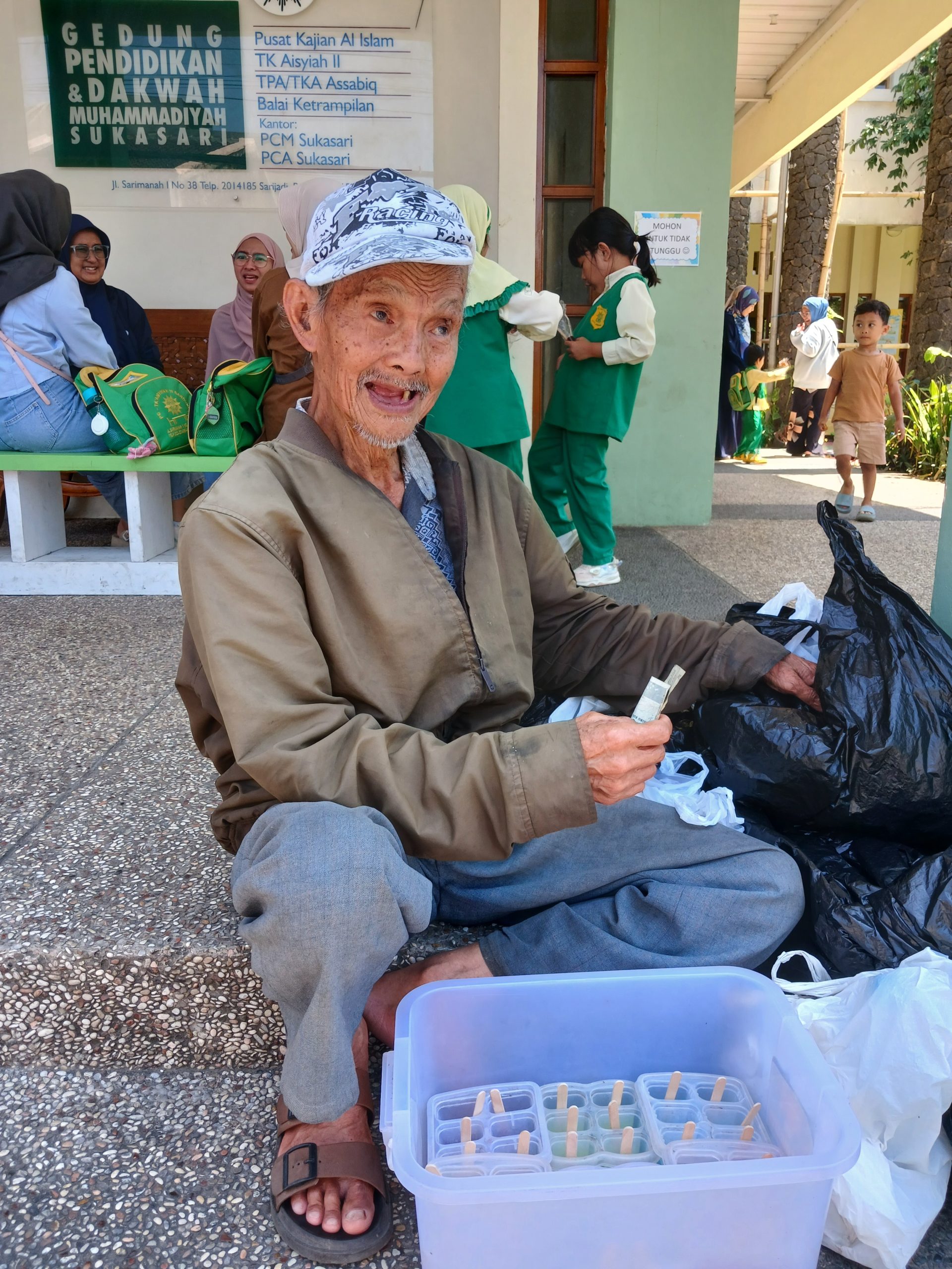 Setiap pagi, Abah membawa kresek berisi jelly buatan tangannya. Ia berkeliling dari Sekolah satu ke sekolah yang lain, menawarkan jajanan kepada anak-anak sekolah dengan senyum terbaik yang bisa ia semaikan.