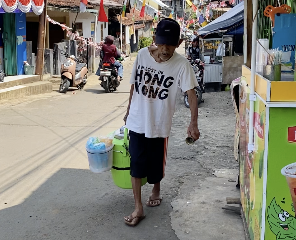 Tangannya bergetar, tapi sorot matanya tetap fokus. Ia biasanya menenteng termos berat berisi es nong-nong, menyusuri jalanan yang sama setiap hari. Depan sekolah, lapangan, atau tempat bermain anak-anak, Abah susuri semua tempat ramai di daerahnya demi bisa menjemput untung recehan.